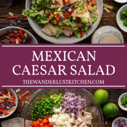 This Mexican Caesar salad recipe takes crisp romaine lettuce and pairs it with bold Mexican flavors to make a delicious dish. Grilled corn, savory chicken, and fresh jalapenos are only a few of the exciting flavors in this salad. It is topped with a creamy dressing that is half Caesar, half salsa, and a hearty squeeze of lime juice to make all the flavors and textures meld together beautifully.
