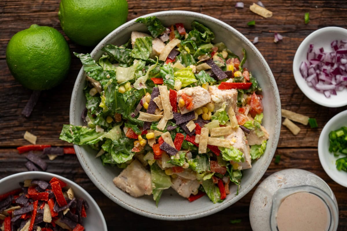 - Finally, add your desired amount of dressing and top with tortilla strips and enjoy!
