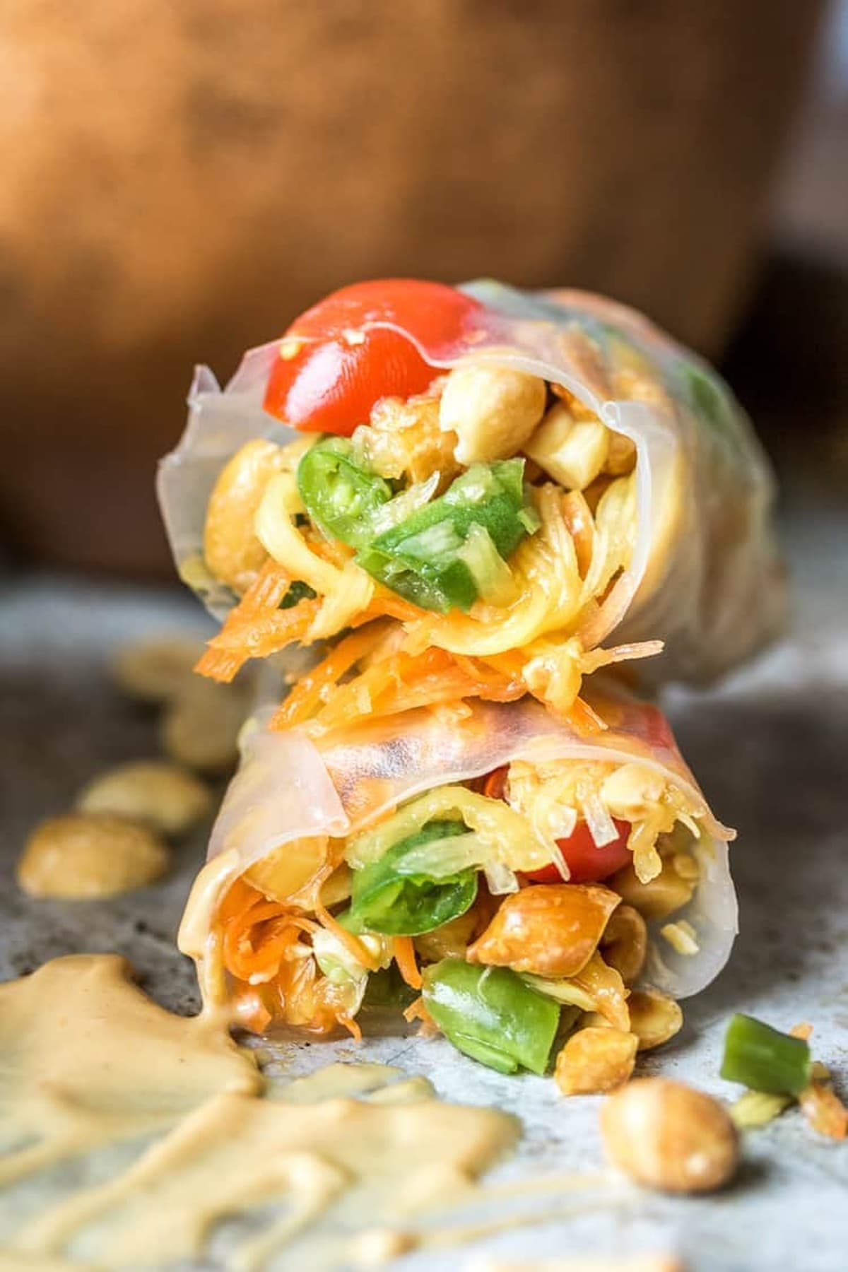 Enjoy the best of both worlds with these Fresh Thai Spring Rolls with Peanut Sauce. These salad rolls bring together fresh green beans, carrots, tomatoes, and green papaya, all enhanced by a delicious peanut sauce.