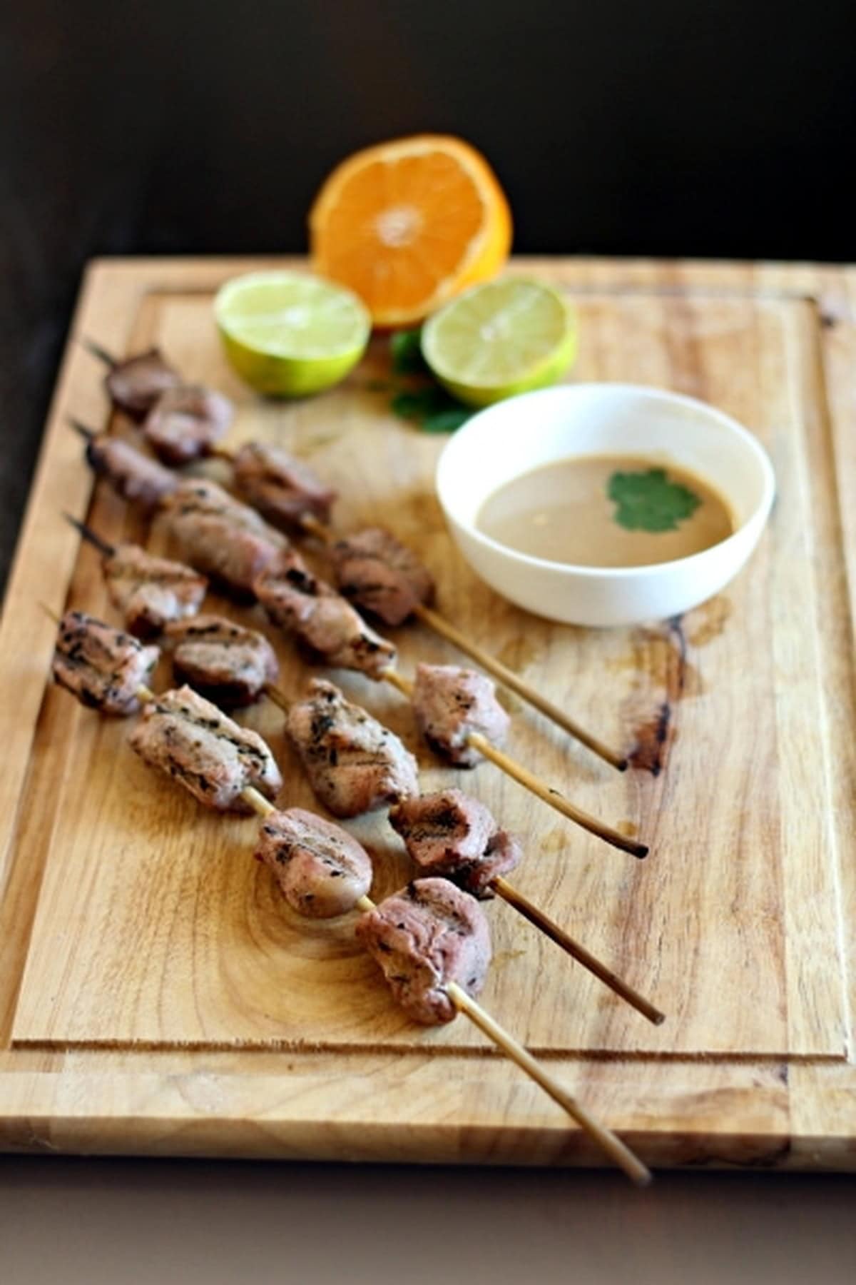 - Heat a grill over medium-high heat. Thread the pork pieces onto the soaked wooden skewers. Grill for 5-7 minutes per side, until well-browned with an internal temperature of 145 degrees F. Serve with the peanut sauce.