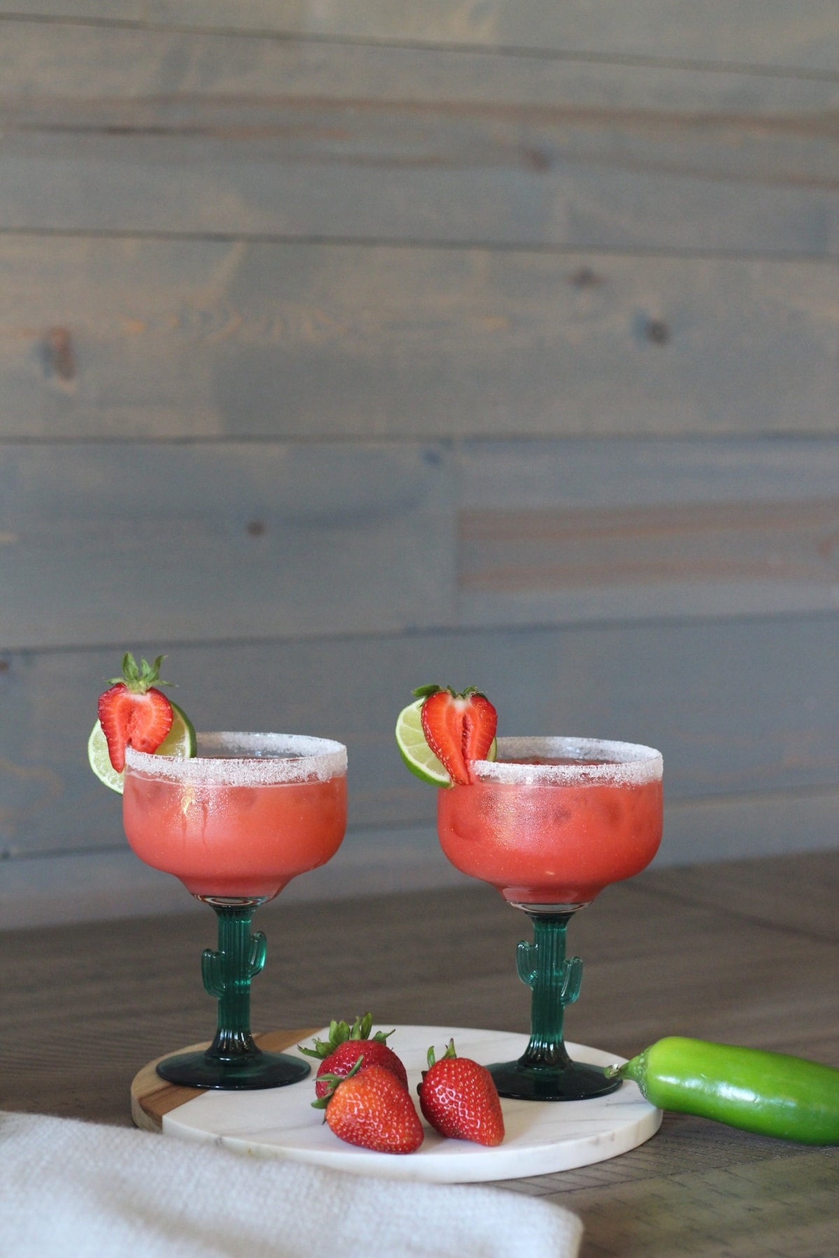 - Finally, pour your Strawberry Jalapeño Margaritas into your favorite cocktail glass over ice and enjoy!