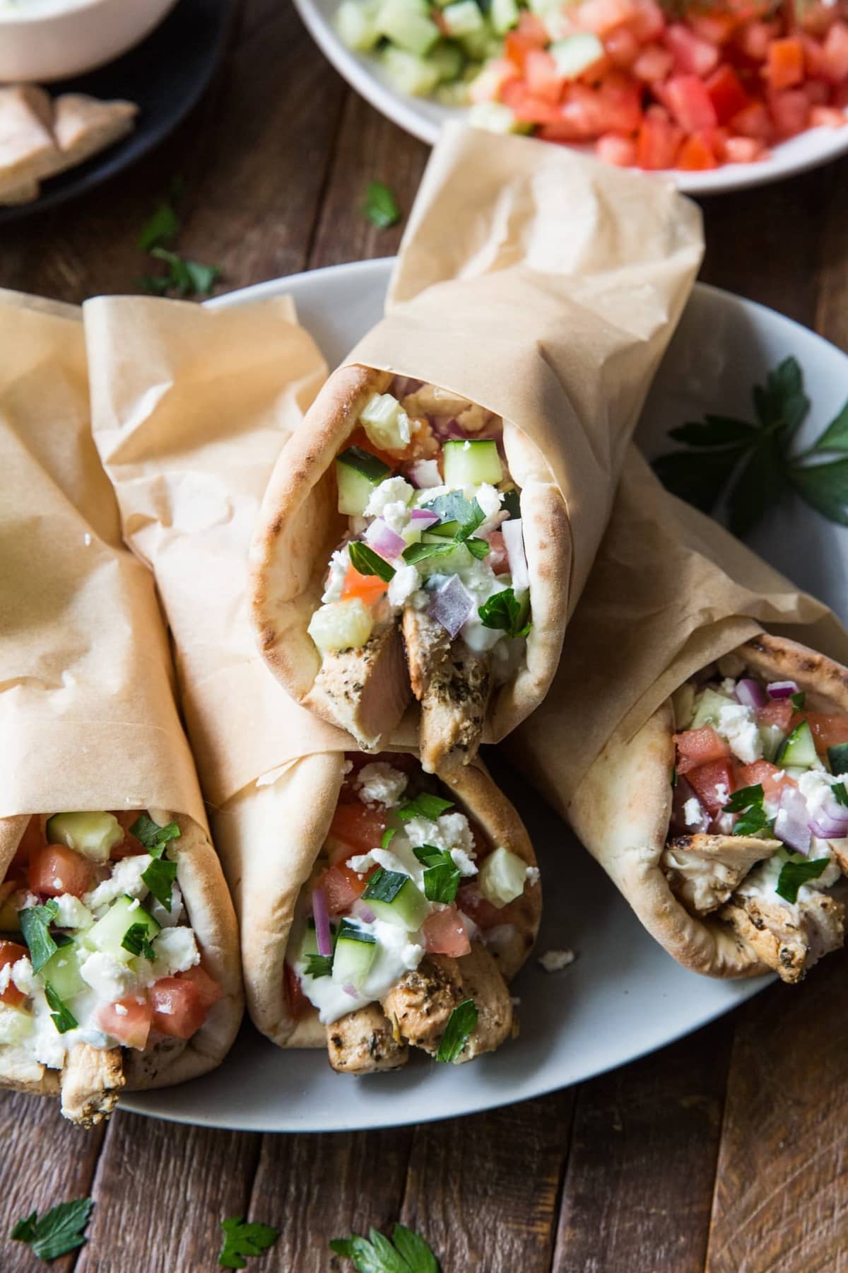 - Lay out a warmed pita bread onto a plate. Place sliced chicken down the middle of the bread. Now, spoon lots of Authentic Greek Tzatziki sauce on top of the chicken. My advice is to go big here so that you are sure to have lots of tzatziki sauce in your gyro. Add the vegetables that you like…cucumber, tomatoes, and red onion. After the veggies, add some feta cheese crumbles and if you like, sprinkle the chopped parsley on top. Fold up the pita bread and enjoy the symphony of flavors in this delicious, Greek Chicken Gyro sandwich that you made at home!