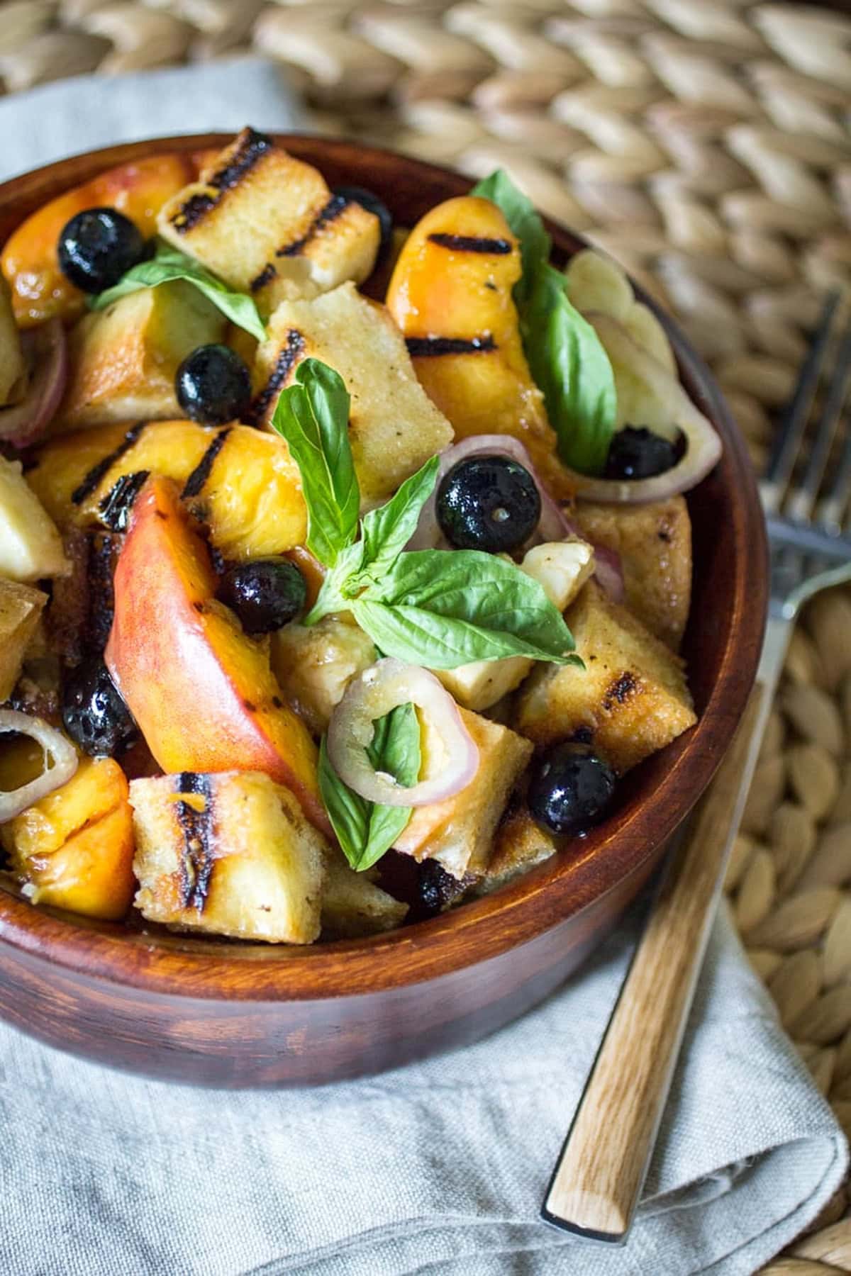 - Once the peaches are grilled, transfer them back into the large serving bowl. Add the bread pieces, blueberries, mozzarella, shallot, and basil to the bowl. Toss well and serve at once.