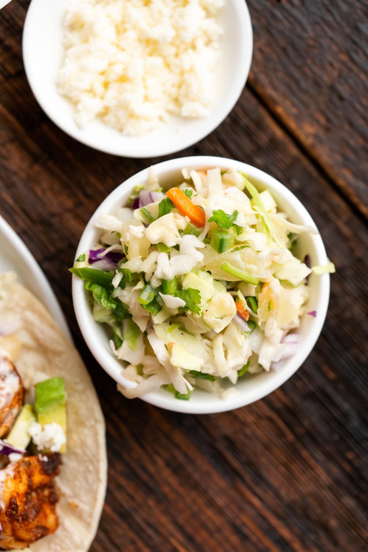- In a large bowl add in the coleslaw, pineapple, green onions, red onion, cilantro, and jalapeno and toss together.
