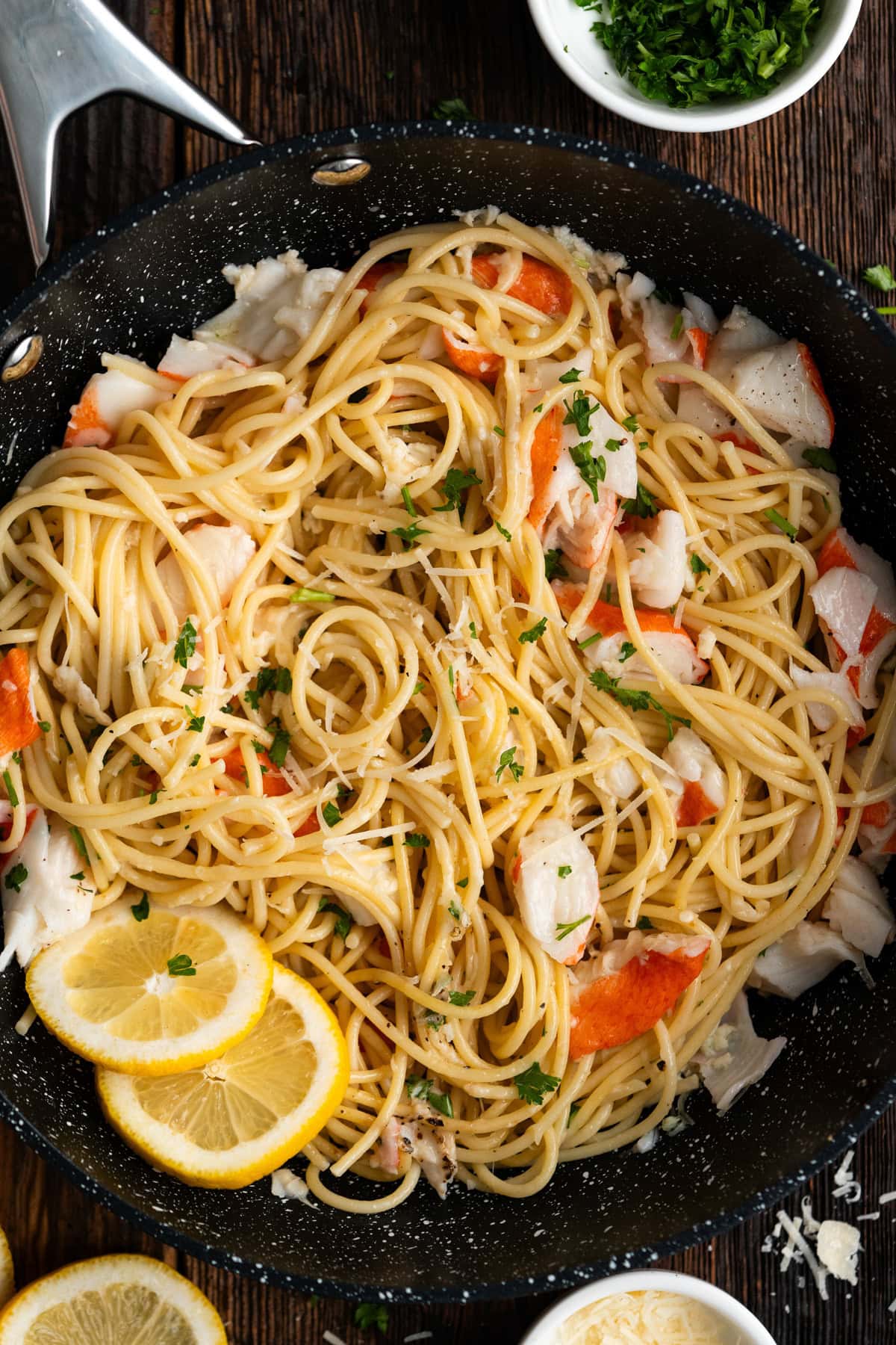 This simple yet flavorful Crab Pasta recipe combines tender crab meat with garlic, lemon, and fresh herbs tossed in a buttery wine sauce that comes together in only 20 minutes!