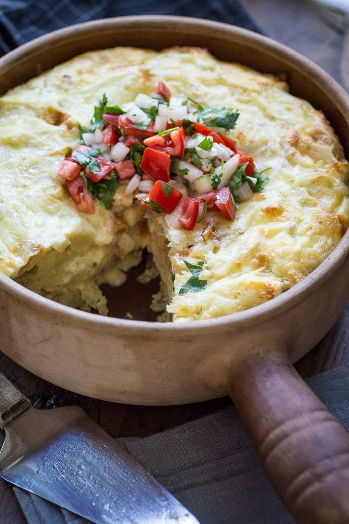 - In a large bowl, whisk together the eggs, milk, salt, cumin, and cayenne pepper. Pour the egg mixture over the bread layers. Use the back of a wooden spoon or spatula to press the bread down until entirely submerged under the egg mixture. Cover and chill for two hours or overnight.