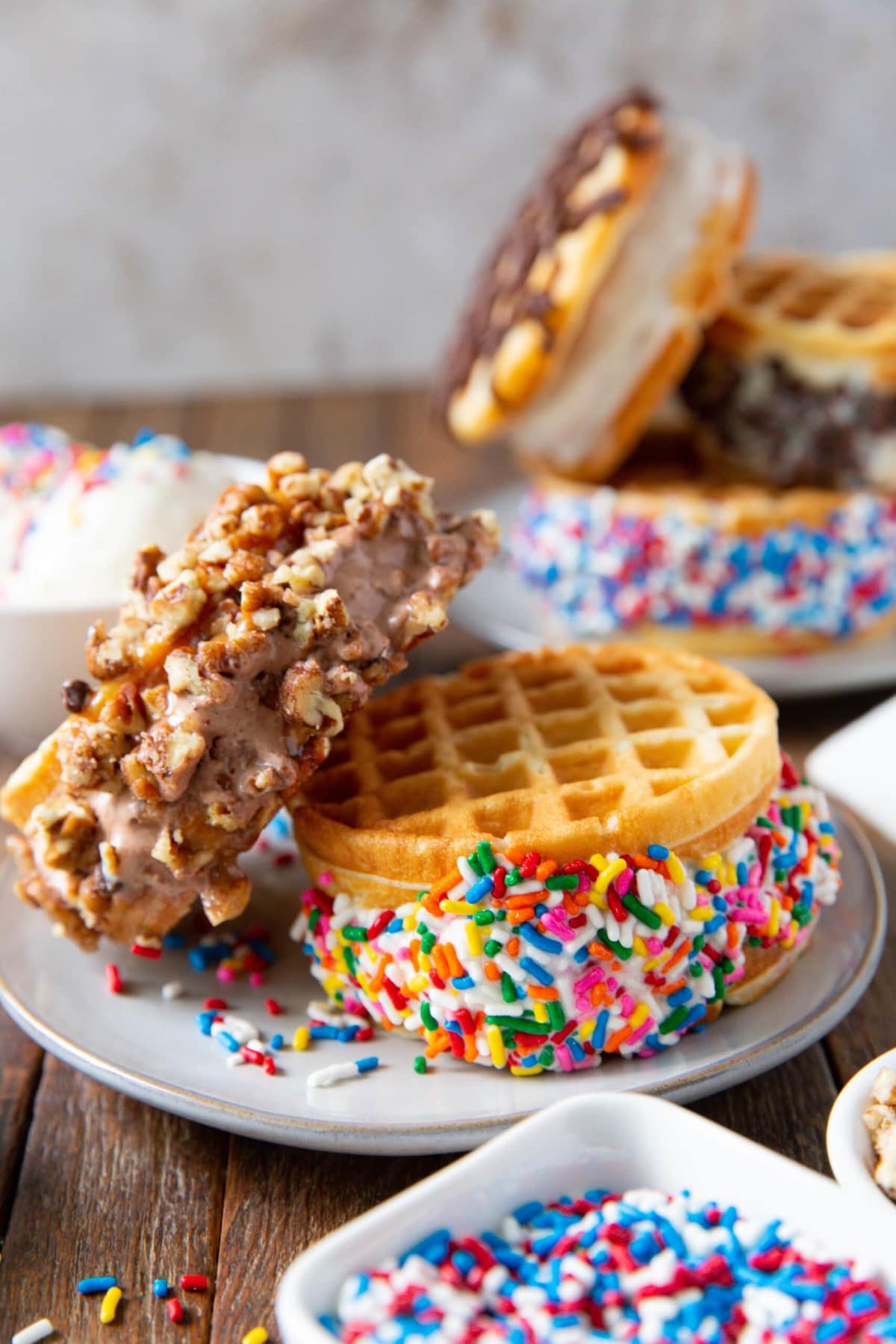 - Take two waffles and add ¾ cup of your favorite ice cream onto one waffle. Place the other waffle on top and gently press down until the ice cream is evenly distributed between the waffles. Then, garnish the outside with your desired toppings.