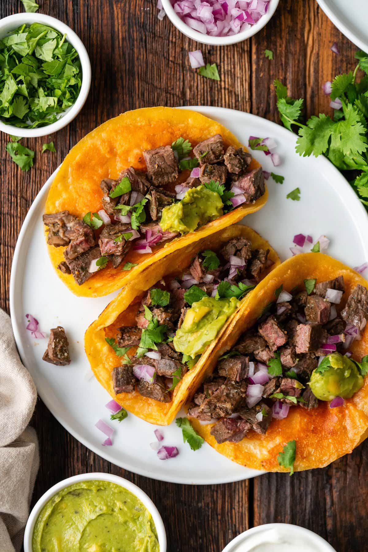 - With the cheese side of the tortilla facing up, dress each taco with steak, red onions, cilantro, and a small spoonful of guacamole, any other toppings you prefer, and enjoy!