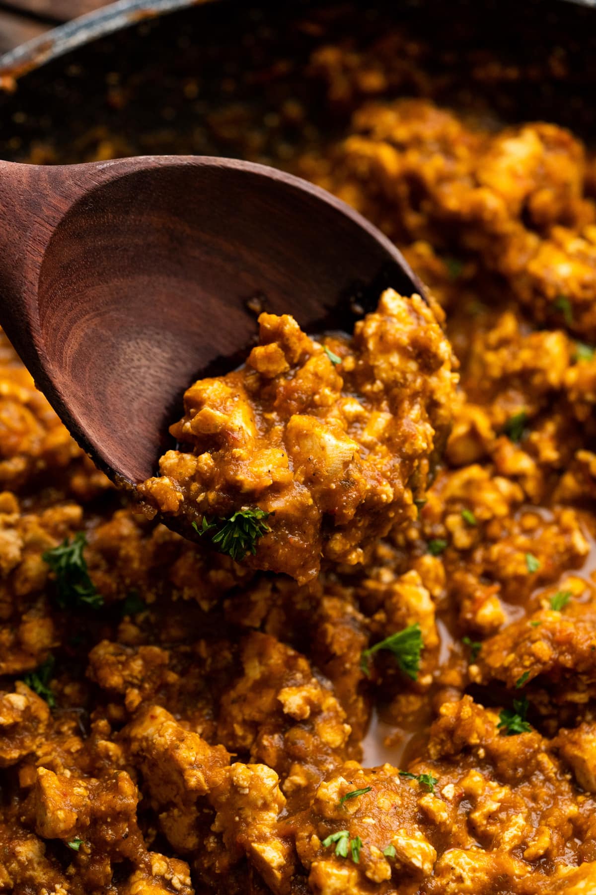 - While the tomato mixture is cooking, cut the tofu into 4 cubes and squeeze out as much water as you can. From there crumble the tofu into pea sized pieces.