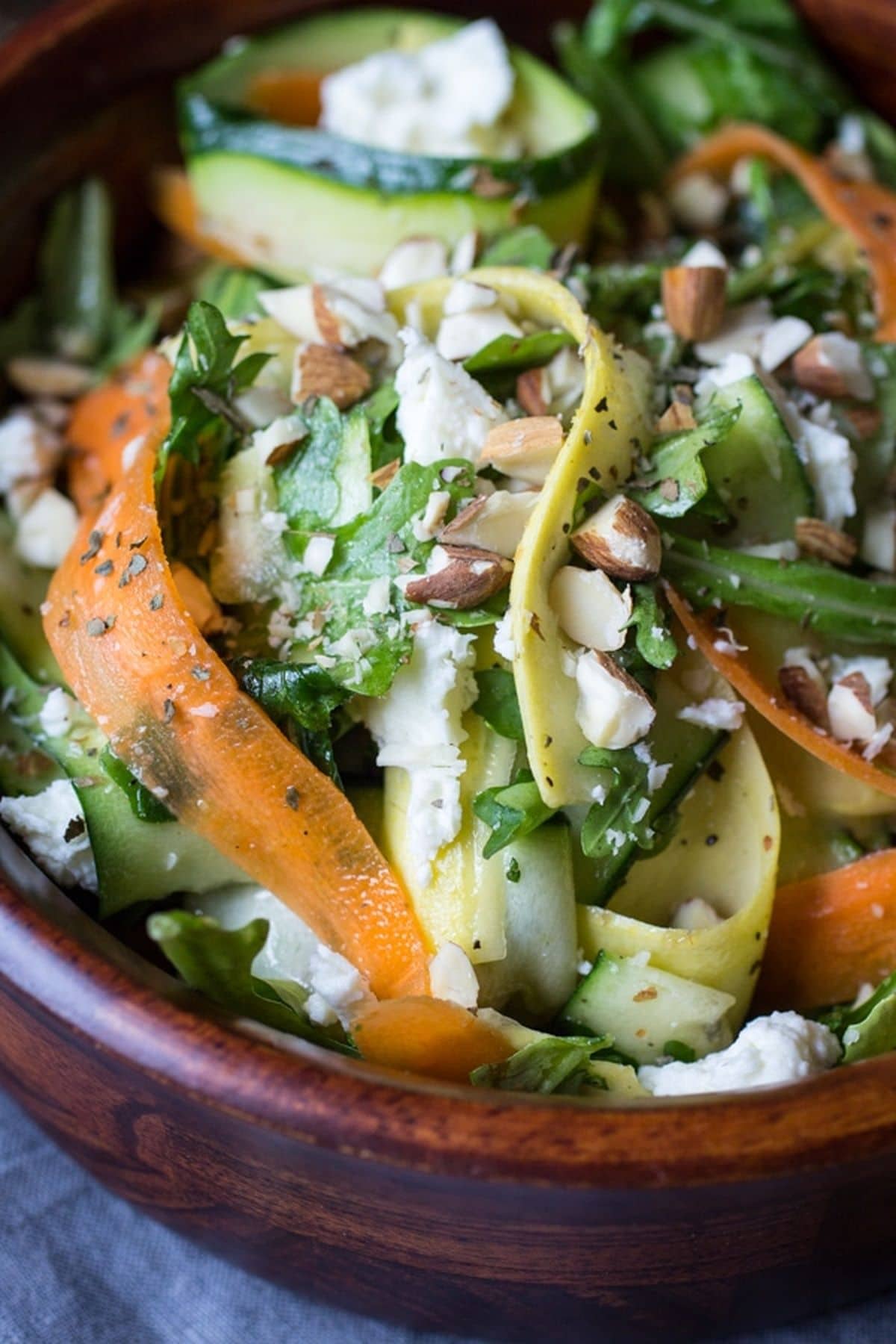 - Place the veggie ribbons and arugula into a large bowl. Toss with the prepared dressing. Top with almonds and feta. Serve at room temperature.