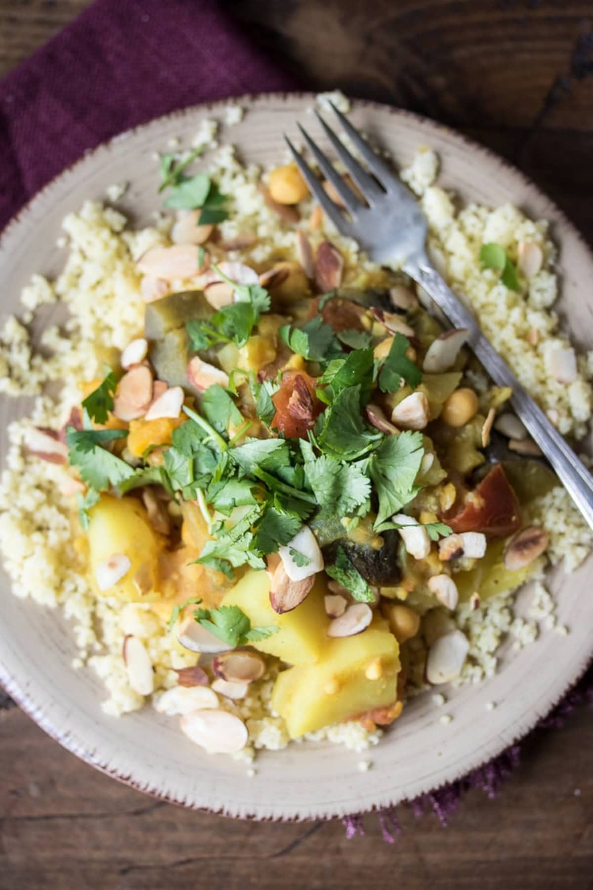 This easy recipe simmers eggplant, potatoes, chickpeas, and dried apricots in a Moroccan-spiced sauce. It’s a one-pot vegan meal that everyone will enjoy.