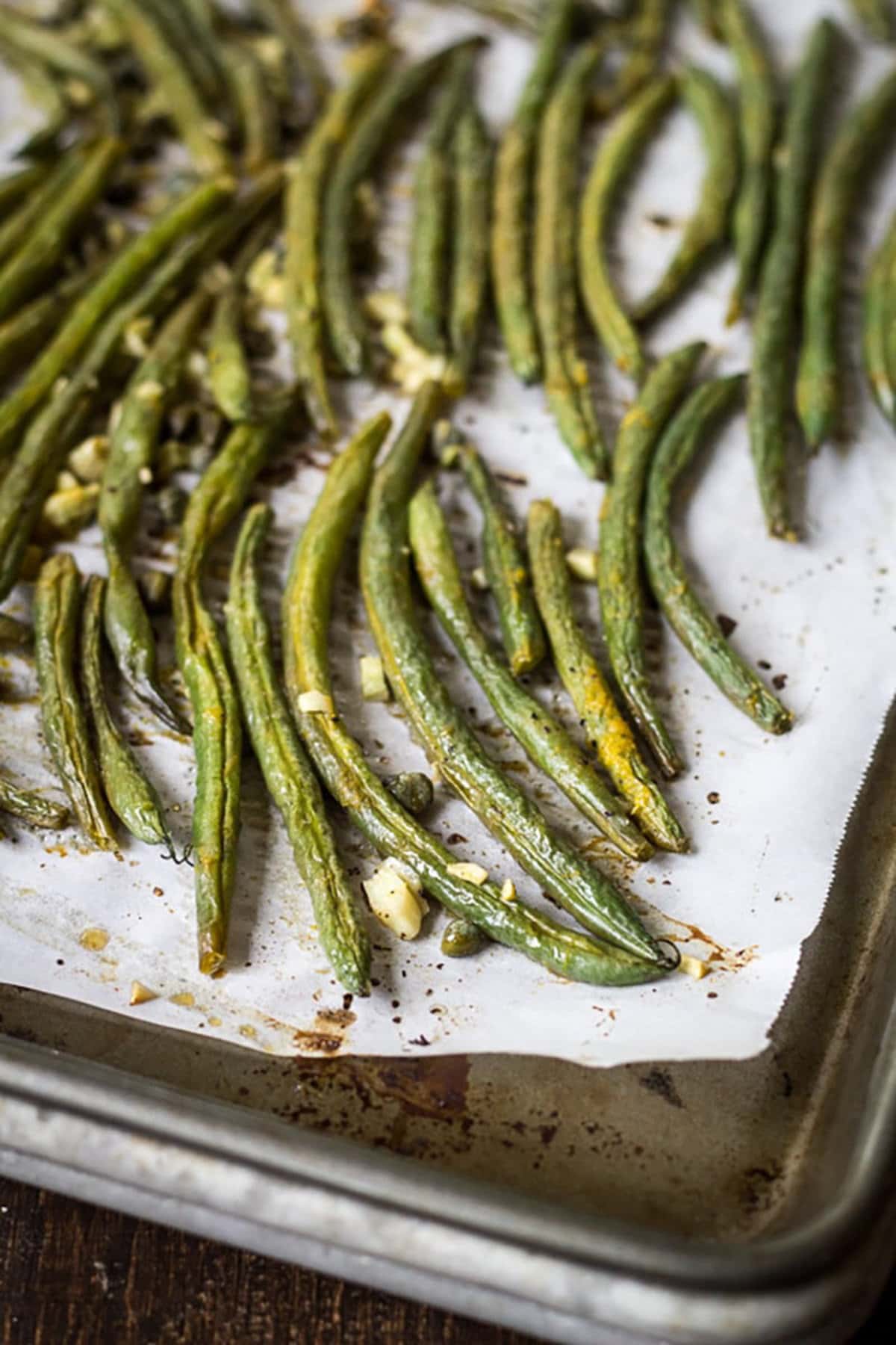 - Scatter the green beans on a parchment-lined rimmed baking sheet. Top with oil, lemon zest and juice, garlic, capers, salt, and pepper. Use your hands, or kitchen tongs, to massage the ingredients together and coat the beans with oil.